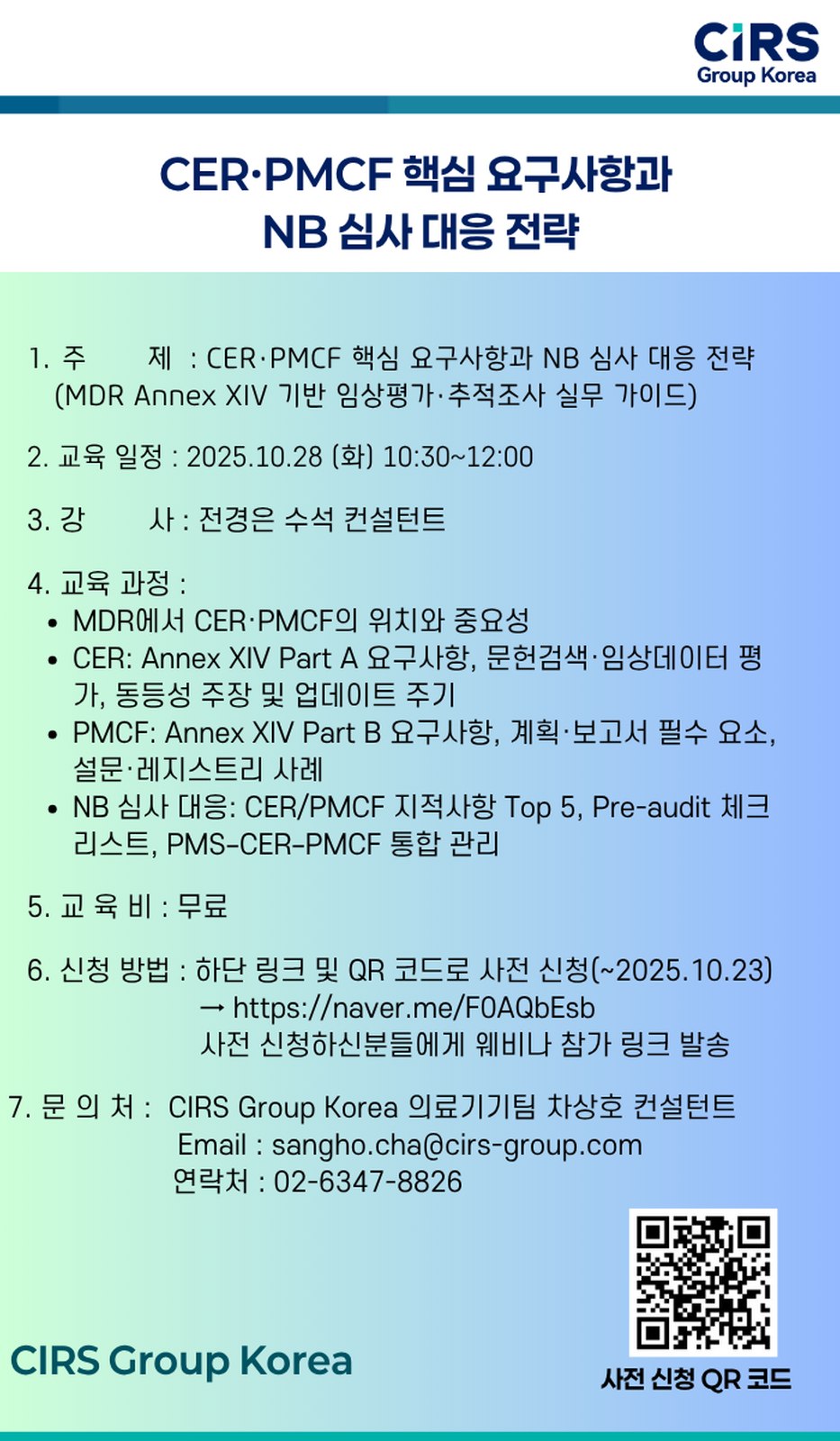 [CIRS Group Korea] EU MDR CER·PMCF 핵심 요구사항과 NB 심사 대응 전략 Webinar 개최 안내