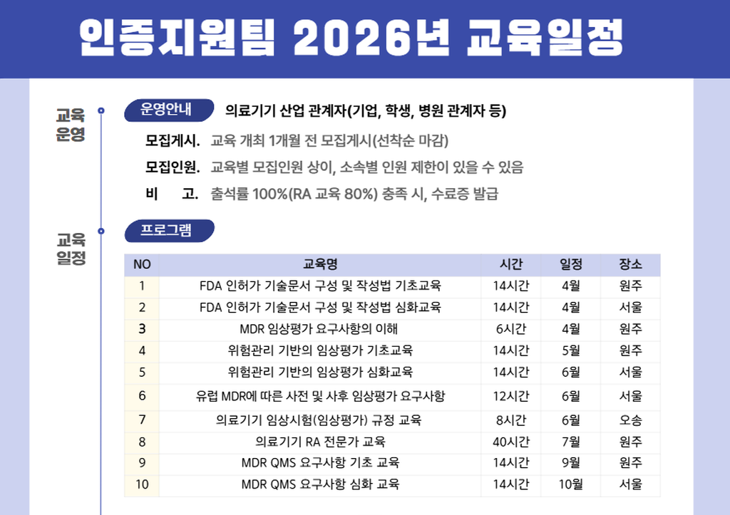 (재)원주의료기기산업진흥원의 2026년 의료기기 인허가 관련 교육 연간 일정을 안내드립니다.